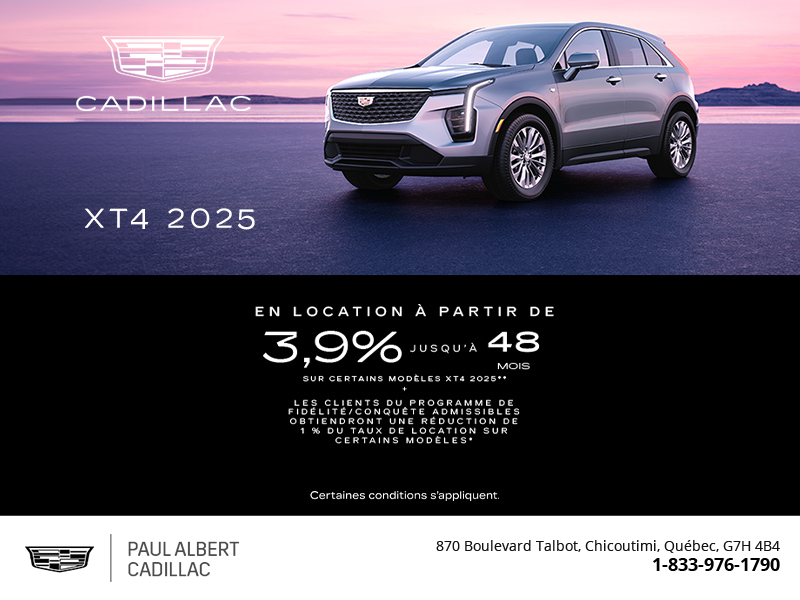 ** L’offre s’adresse aux personnes admissibles au Québec et s’applique à certains modèles Cadillac XT4 Sport 2025 neufs n’ayant jamais été immatriculés qui ont été loués entre le 2 décembre 2025 et le 2 janvier 2026. Contrat de location à 3,9 % pendant 48 mois offert sur approbation de crédit par les Services de financement auto TD, la Banque Scotiaᴹᴰ ou RBC Banque Royale. Les noms des institutions financières participantes sont fournis sous réserve de modification. Les taux des autres institutions financières peuvent varier. Un versement initial, un échange ou un dépôt de garantie peuvent être exigés. Les versements aux deux semaines varient selon la somme empruntée et la valeur du versement initial ou de l’échange. Exemple d’un contrat de location représentatif pour un modèle XT4 Sport 2025 admissible avec un prix à l’achat au comptant de 55 250 $ loué à un taux annuel de 3,9 % : le versement aux deux semaines s’élève à 390 $ pendant 48 mois, avec un versement initial de 0 $. Un total de 104 versements aux deux semaines est requis. L’offre comprend 2 600 $ de frais de transport; 100 $ de taxe de climatisation; jusqu’à 49 $ de frais réglementaires et d’écofrais; jusqu’à 699 $ de frais administratifs du concessionnaire; les frais d’enregistrement de sûreté (frais gouvernementaux et d’agence, pour un total allant jusqu’à 159,53 $); ainsi que tous les autres frais, droits et taxes applicables (lesquels peuvent varier selon le concessionnaire). Frais d’immatriculation et d’assurance; droit spécifique sur les pneus neufs et taxes de vente applicables en sus. Le versement initial ou l’échange de 0 $, le dépôt de garantie de 0 $ et le premier versement doivent être payés à la date d’entrée en vigueur de la location. 16 000 km compris; 0,10 $ pour chaque kilomètre excédentaire. Les concessionnaires peuvent fixer leurs propres prix. Une commande à l’usine ou un échange par le concessionnaire peut être requis. Offre d’une durée limitée qui ne peut être combinée à certaines autres offres. La Compagnie General Motors du Canada se réserve le droit de modifier, de prolonger ou d’annuler ces offres, en tout ou en partie, pour quelque raison que ce soit, à tout moment et sans préavis. Certaines conditions et restrictions s’appliquent. Tous les détails chez votre concessionnaire. Ces offres ne sont pas monnayables et ne peuvent pas être combinées à certains autres incitatifs offerts aux consommateurs. L’offre est nulle là où la loi l’interdit. Les frais facturables pour la peinture varient selon le véhicule ou la couleur. Tous les détails chez votre concessionnaire. ᴹᴰ Marque déposée de La Banque de Nouvelle-Écosse. RBC et Banque Royale sont des marques déposées de la Banque Royale du Canada. Services de financement auto TD est une marque déposée de La Banque Toronto-Dominion.